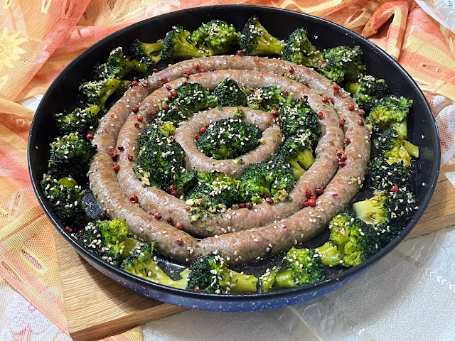 In una teglia da forno circolare, predisporre broccoli e salsicce in modo alternato da formare una girella e spolverare la superficie con semi di sesamo e pepe rosa.